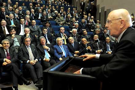 Il Presidente Giorgio Napolitano durante il suo indirizzo di saluto, in primo piano alcuni grandi industriali della Regione