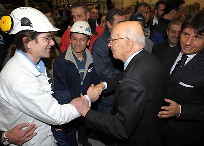 Il Presidente Giorgio Napolitano, in visita ai Cantieri dell'Azienda CNR-Gruppo Ferretti, saluta un gruppo di operai al termine della visita.