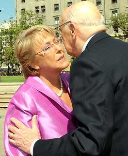 Il cordiale incontro del Presidente Giorgio Napolitano con il Presidente della Repubblica del Cile Michelle Bachelet all'arrivo a Palazzo della Moneda.