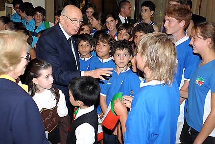Il Presidente Giorgio Napolitano con la moglie Clio tra i bambini del Circolo Italiano, in occasione dell'incontro con la Collettività italiana