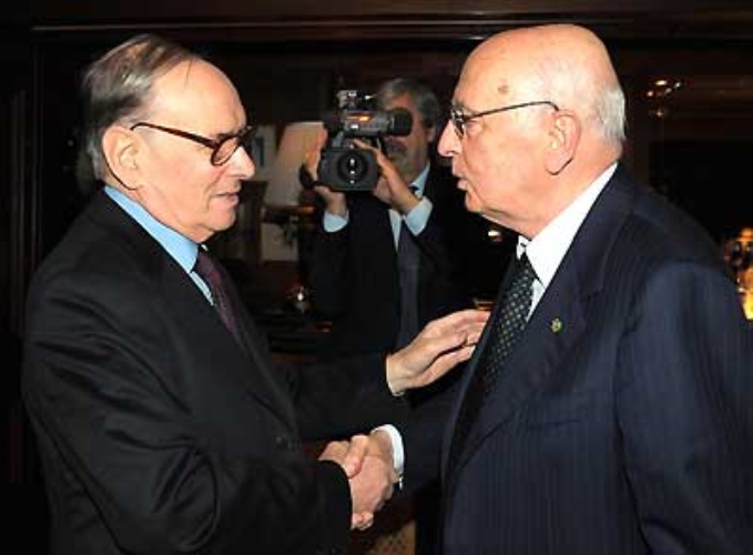 Il Presidente Giorgio Napolitano con il Maestro Ennio Morricone, prima della partenza per l'Italia. Il Maestro Morricone è nella Capitale cilena per un Concerto.