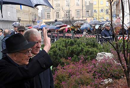 Il Presidente Giorgio Napolitano risponde al saluto della gente al suo arrivo a Gorizia
