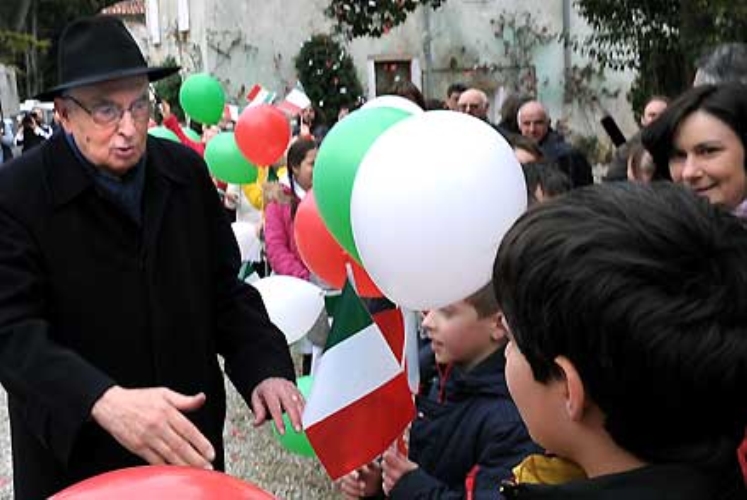 Il Presidente Giorgio Napolitano festeggiato da alcune scolaresche all'arrivo al Castello di Brazzà