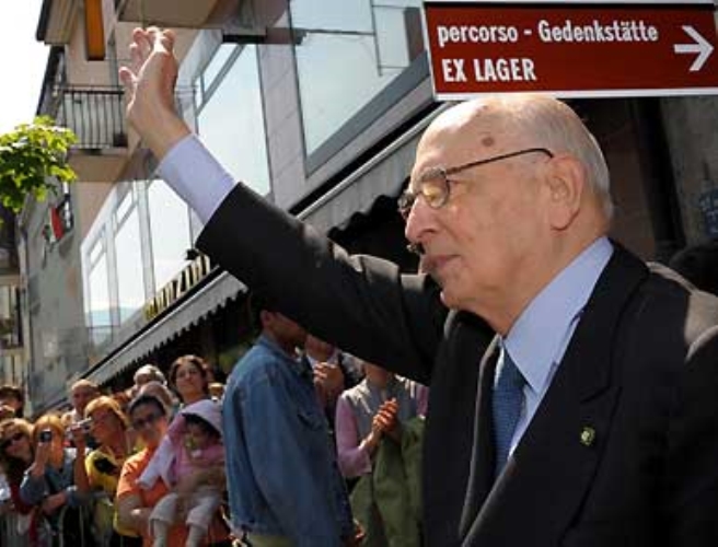 Il Presidente Giorgio Napolitano nei pressi del "Muro" di via Resia, risponde al saluto dei cittadini.