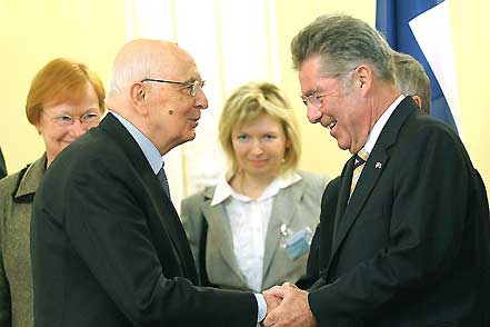 Il Presidente Giorgio Napolitano accolto all'arrivo a Grazer Burg, dal Presidente Federale d'Austria, Heinz Fischer in occasione dell'incontro informale multilaterale dei Capi di Stato
