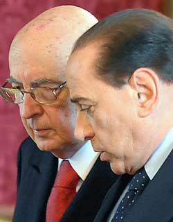 Il Presidente Giorgio Napolitano con il Presidente del Consiglio Silvio Berlusconi al termine della cerimonia di giuramento dei nuovi Ministri