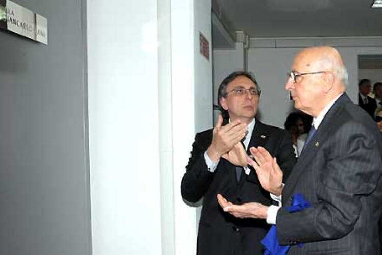 Il Presidente Giorgio Napolitano con Lucio D'Alessandro, Direttore della Scuola di Giornalismo durante la cerimonia di intitolazione a Giancarlo Siani dell'Aula multifunzionale