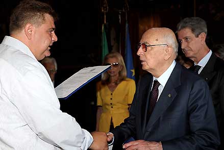 Il Presidente Giorgio Napolitano consegna la Medaglia d'Oro al Valor Civile alla memoria di Denis Zanon, al fratello Massimo