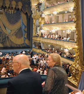 Il Presidente Giorgio Napolitano con la moglie Clio durante la rappresentazione al Teatro Marinskij.