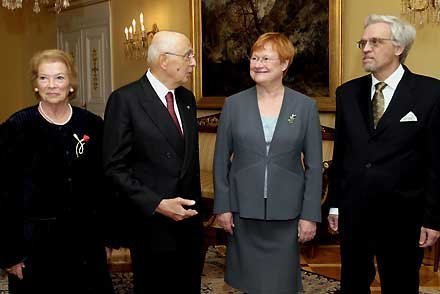 Il Presidente della Repubblica Italiana Giorgio Napolitano e il Presidente della Repubblica di Finlandia Tarja Halonen con i rispettivi consorti Clio e Arajarvi nell'incontro a Palazzo Presidenziale