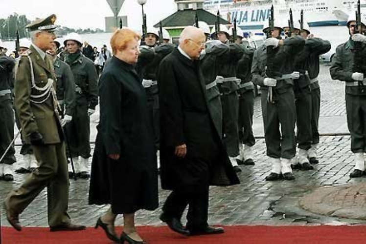 Il Presidente Giorgio Napolitano accompagnato dal Presidente della Repubblica di Finlandia Tarja Halonen durante la cerimonia di benvenuto