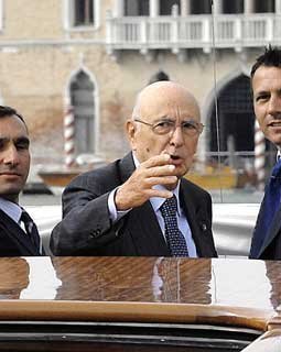 Il Presidente Giorgio Napolitano al suo arrivo nella città lagunare risponde al saluto della gente