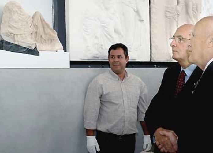 I Presidenti di Italia e Grecia, Napolitano e Papoulias, davanti al frammento del fregio del Partenone, prestato dalla Regione Sicilia.
