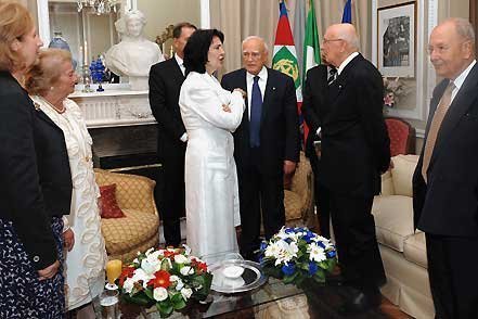 Il Presidente Napolitano con la moglie Clio, la Coppia Presidenziale Ellenica e l'ex Presidente Stefanopulos, si intrattiene con la popolare attrice Irene Papas, durante il ricevimento in Ambasciata