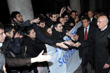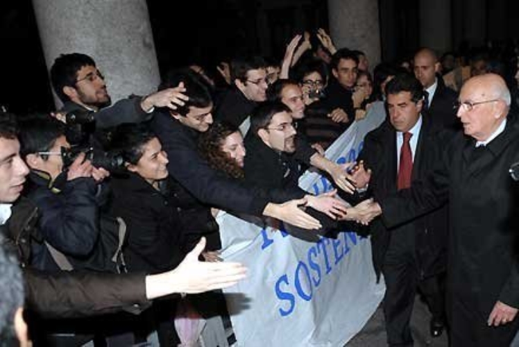 Il Presidente Giorgio Napolitano salutato dai giovani dell'Università degli Studi di Milano al termine dell'incontro con i Rettori degli Atenei Lombardi