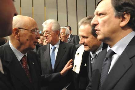 Il Presidente Napolitano con J. M. Barroso Presidente della Commissione Europea, il Presidente dell'Univ. Commerciale Bocconi e il Rettore Angelo Provasoli al termine della cerimonia di inaugurazione