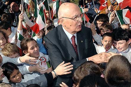 Il Presidente Giorgio Napolitano tra i ragazzi delle scuole al suo arrivo a Villa Giusti