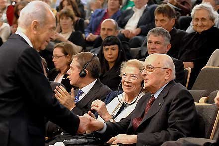 Il Presidente Giorgio Napolitano, con la moglie Clio, si congratula con il Presidente Shimon Peres al termine dell'intervento all'Istituto Van Leer