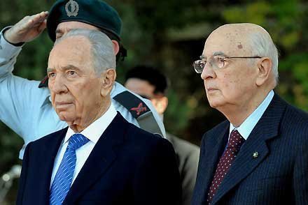 I Presidenti della Repubblica Italiana Giorgio Napolitano e dello Stato d'Israele, Shimon Peres a Palazzo Presidenziale durante la cerimonia di accoglienza