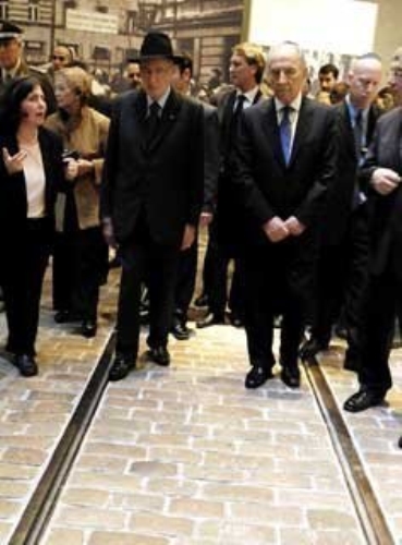 Il Presidente Giorgio Napolitano con la moglie Clio, accompagnato dal Presidente dello Stato d'Israele Shimon Peres durante la visita al Museo dell'Olocausto