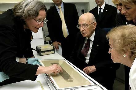 Il Presidente Napolitano con la moglie Clio, osserva un frammento dei Rotoli del Mar Morto con la scrittura dè "I Dieci Comandamenti" di 2000 anni fa, commentati dalla Direttrice del Padiglione, Shor