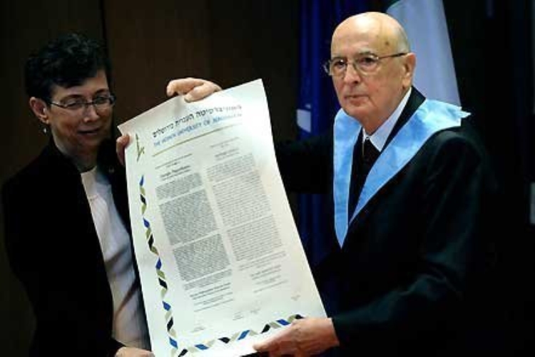 Il Presidente Giorgio Napolitano riceve il Diploma di Laurea Honoris Causa in Filosofia da Sarah Stroumsa, Rettore dell'Università Ebraica di Gerusalemme