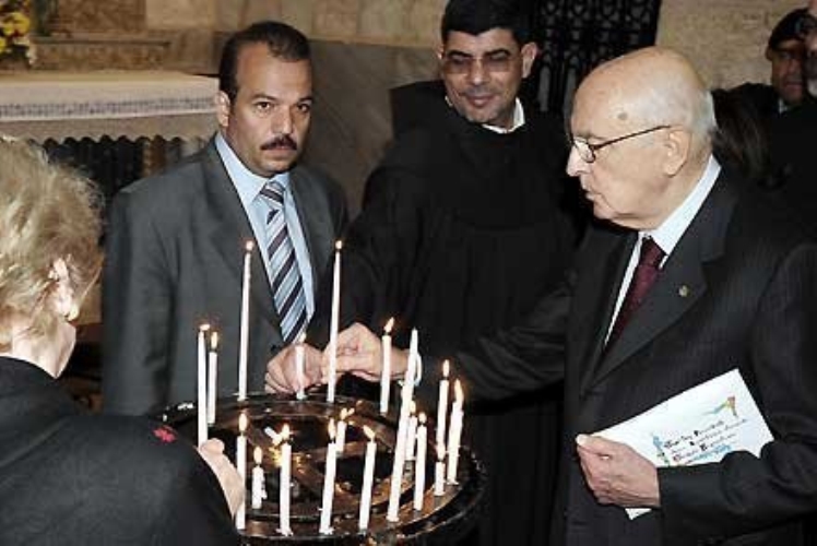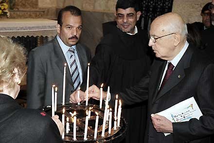 Il Presidente Giorgio Napolitano con la moglie Clio durante la visita alla Basilica della Natività