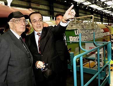 Il Presidente Giorgio Napolitano accompagnato da Giovanni Bertolone, Amministratore Delegato di Alenia Aeronautica, visita l'Hangar ATR-Assemblaggio Fusoliera.