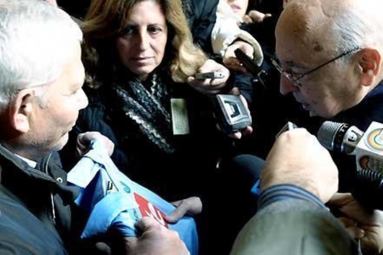Il Presidente Giorgio Napolitano riceve una maglietta del Napoli calcio da un tifoso all'uscita da Palazzo Filomarino