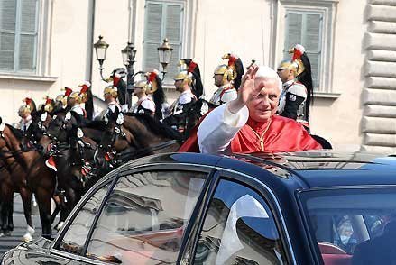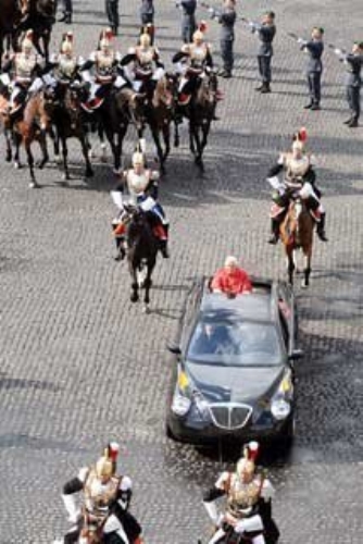 Sua Santità Benedetto XVI° al suo arrivo al Palazzo del Quirinale, scortato dal Reggimento Corazzieri