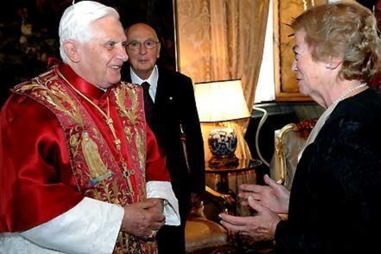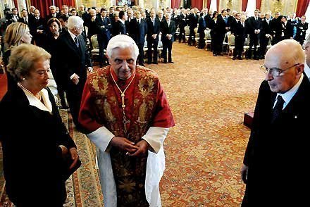 Il Sommo Pontefice Benedetto XVI con il Presidente della Repubblica Giorgio Napolitano e la moglie Clio in occasione della Visita Ufficiale al Quirinale