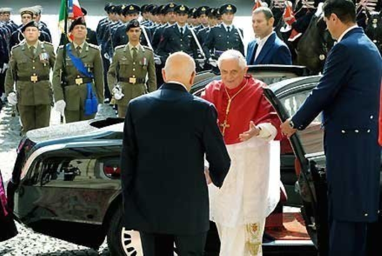Sua Santità Benedetto XVI° lascia il Palazzo del Quirinale dopo essersi congedato dal Capo dello Stato
