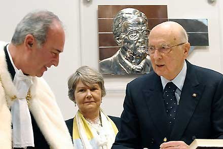 Il Presidente Napolitano con G. Andreatta ed il Magnifico Rettore G. Latorre, davanti al bassorilievo di Nino Andreatta al quale è stata intitolata l'Aula Magna dell'Univ. degli Studi della Calabria