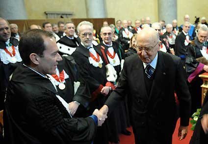 Il Presidente Napolitano al termine della cerimonia celebrativa del secondo centenario dell'Orazione inaugurale foscoliana e dell'apertura dell'Anno Accademico dell'Università degli Studi di Pavia