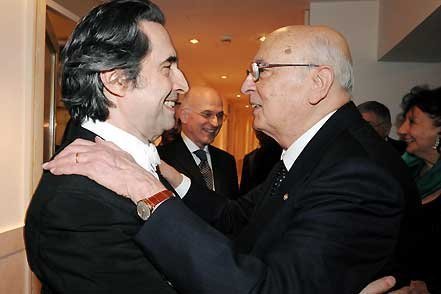 Il Presidente Giorgio Napolitano si congratula con il Maestro Riccardo Muti al termine del concerto celebrativo del restauro del Teatro di San Carlo