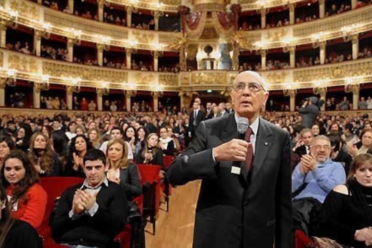 Il Presidente Giorgio Napolitano rivolge il suo augurio a coloro i quali hanno contribuito al restauro del Teatro San Carlo in occasione della visita in Teatro in compagnia della moglie Clio