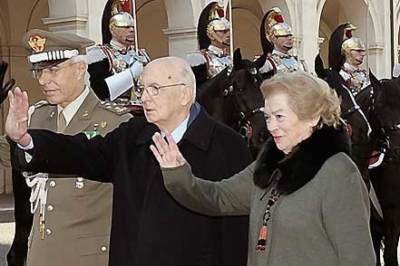 Il Presidente Giorgio Napolitano e la moglie Clio salutano i coniugi Parvanov al termine della visita di Stato in Italia