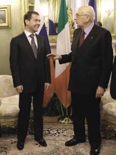 Il Presidente Giorgio Napolitano con il Presidente della Federazione Russa Dmitry Medvedev al termine dei colloqui in Prefettura