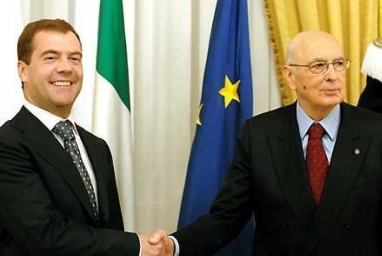 Il Presidente Giorgio Napolitano con il Presidente della Federazione Russa, Dmitry Medvedev all'arrivo in Prefettura