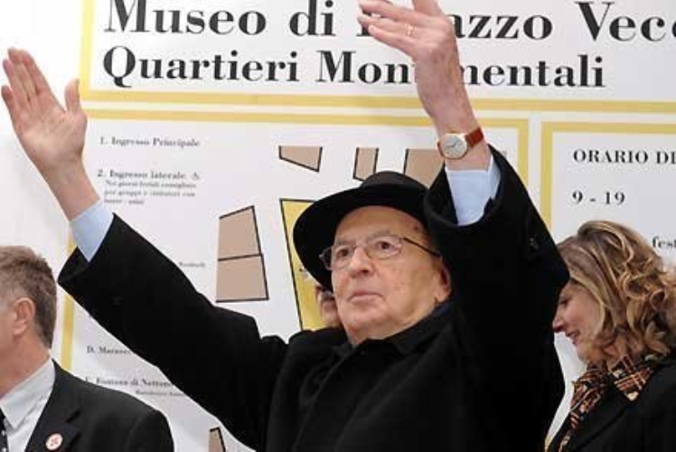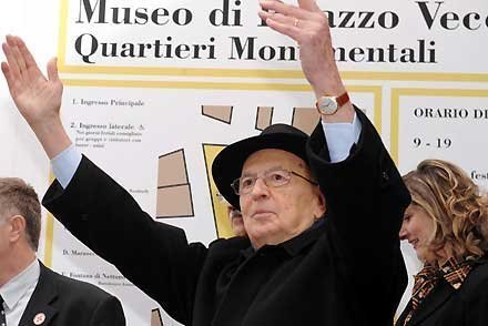 Il Presidente Giorgio Napolitano risponde al saluto della gente su Piazza della Signoria, al termine del Convegno su "Eugenio Garin"