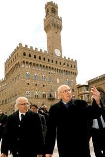 Il Presidente Giorgio Napolitano, accompagnato dal Prefetto Andrea De Martino su Piazza della Signoria, al termine dell'apertura del Convegno "Eugenio Garin. Dal Rinascimento all'Illuminismo"