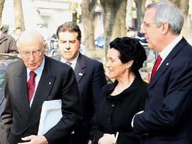 Il Presidente Giorgio Napolitano insieme ad Aldo Tomasi e Paola Reggiani Gelmini, al suo arrivo all'auditorium della Fondazione Marco Biagi