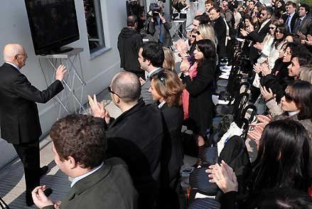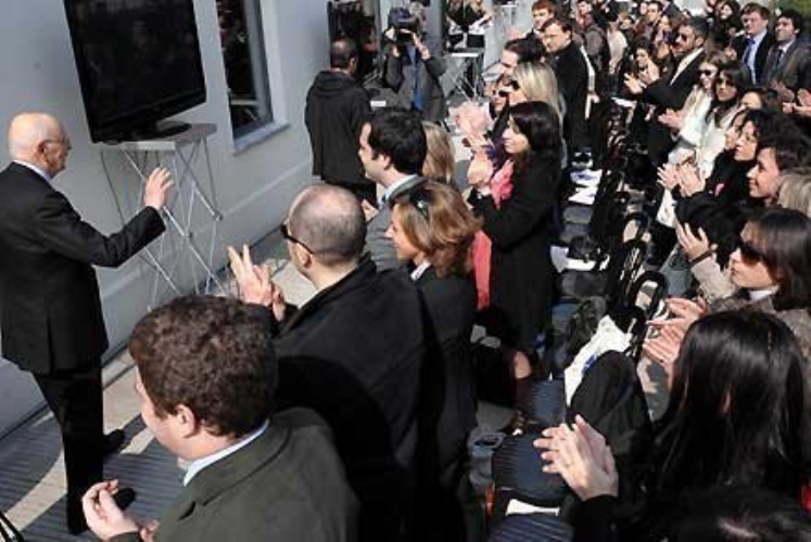 Il Presidente Giorgio Napolitano salutato dai giovani della Fondazione "Marco Biagi" all'arrivo all'Auditorium