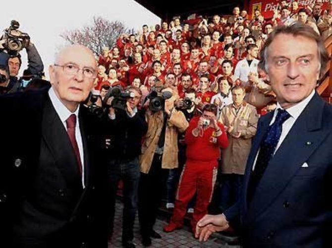 Il Presidente Giorgio Napolitano con Luca Cordero di Montezemolo, Presidente del Gruppo Ferrari-Maserati, durante la visita allo stabilimento di Maranello
