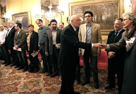 Il Presidente Giorgio Napolitano con alcuni rappresentanti sindacali ed i lavoratori di alcune azienda della Provincia di Torino durante l'incontro in Prefettura