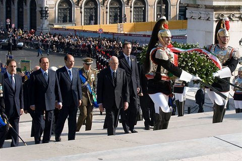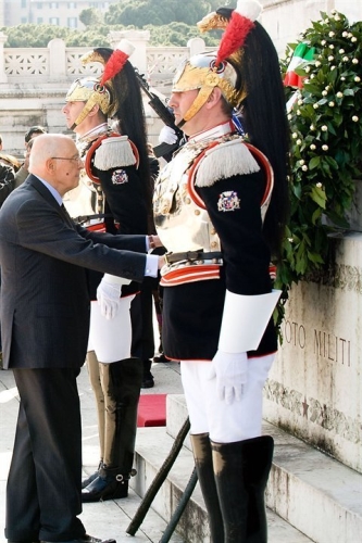 Il Presidente Giorgio Napolitano durante la deposizione di una corona d'alloro all'Altare della Patria, in occasione del 64° anniversario della Liberazione