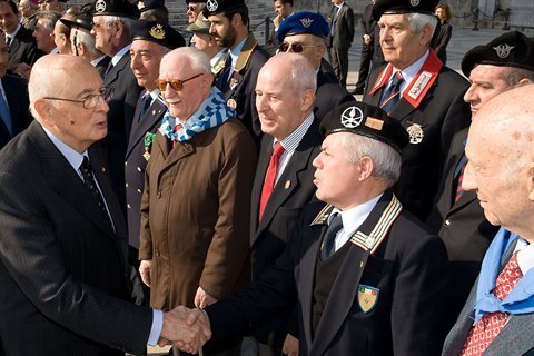 Il Presidente Giorgio Napolitano saluta i Presidenti delle Associazioni Combattentistiche e d'Arma, subito dopo la deposizione di una corona d'alloro all'Altare della Patria