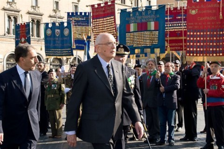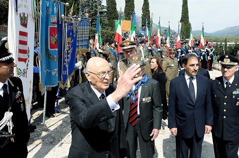 Il Presidente Giorgio Napolitano rende omaggio alle Bandiere e ai Gonfaloni decorati, in occasione dell'anniversario della Liberazione