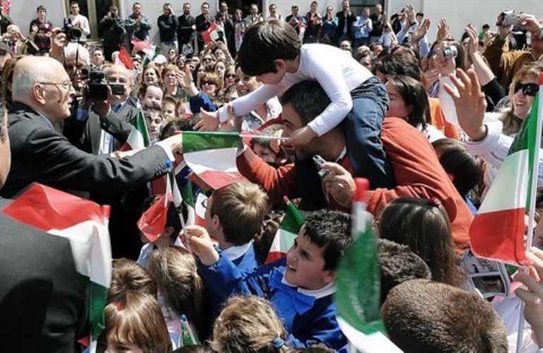Il Presidente Giorgio Napolitano al suo arrivo nel Paese festeggiato dai cittadini, dopo aver reso omaggio al Sacrario dei Caduti