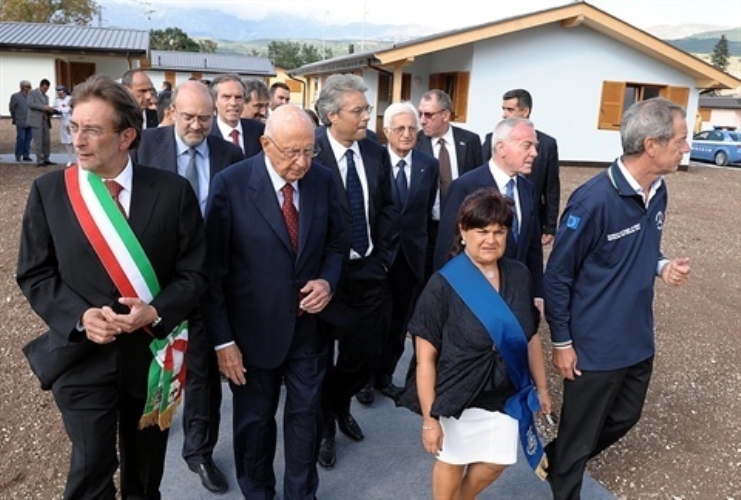 Il Presidente Giorgio Napolitano con le Autorità locali durante la visita alle case prefabbricate